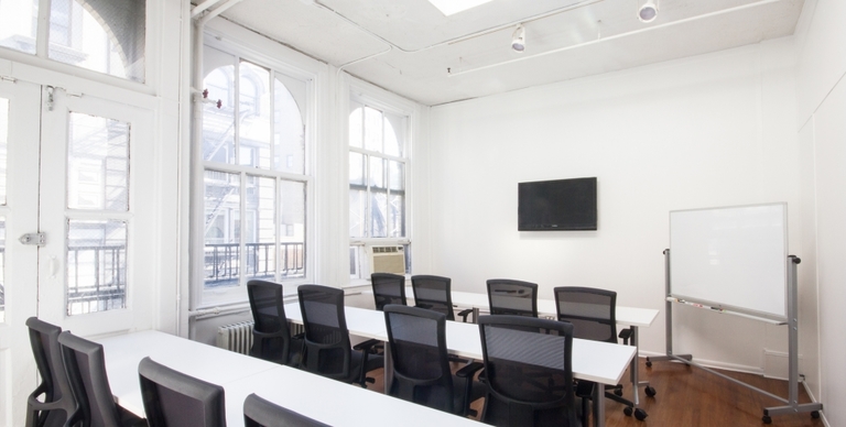 Our private conference room features seating for 12 people, 55" monitor with wireless streaming, video conference system, and whiteboard. The room can be transformed for photography or film shoots, with a skylight providing ample natural light. Our main workspace features ample seating and desk space, kitchenette, and projector and screen.