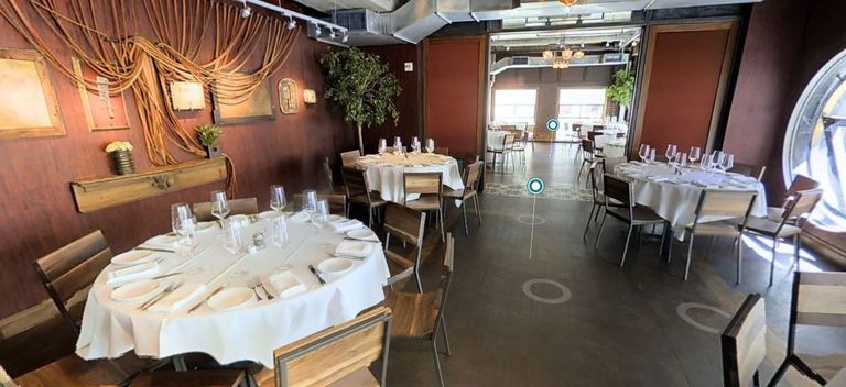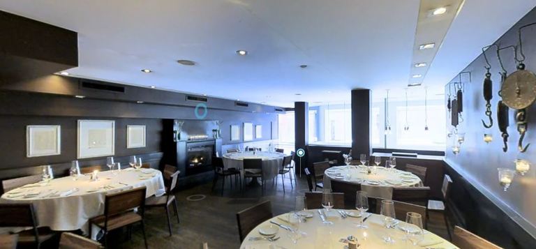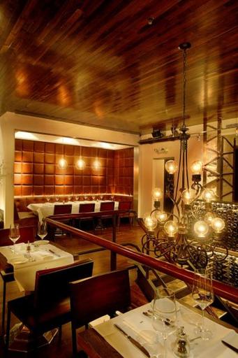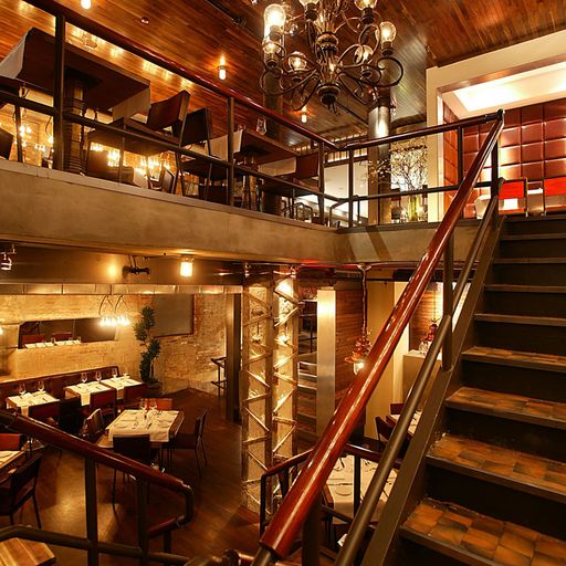 Quality Meats features modern interpretations of familiar dishes and flavor combinations, resulting in unique tastes, innovative presentations, and a distinctive Quality Meats style. The warm, industrial décor by award winning designers AvroKO draws on cues from traditional New York City butcher shops, in the use of warm wood, stainless steel, and white marble. The space succeeds in being simultaneously rustic, inviting, and luxurious with rich details. Interior details include an homage to a traditional “meat locker” interior with finished walnut planks covering the length of the downstairs dining room wall, butcher block end‑grain wood as the primary material for the staircase, and vintage market scales that have been transformed into a lighting installation in the upstairs dining room. These elements coexist flawlessly with understated accents drawn directly from butcher shop inspiration, such as white ceramic tiles, and chandeliers made of pulleys and large steel butcher hooks.